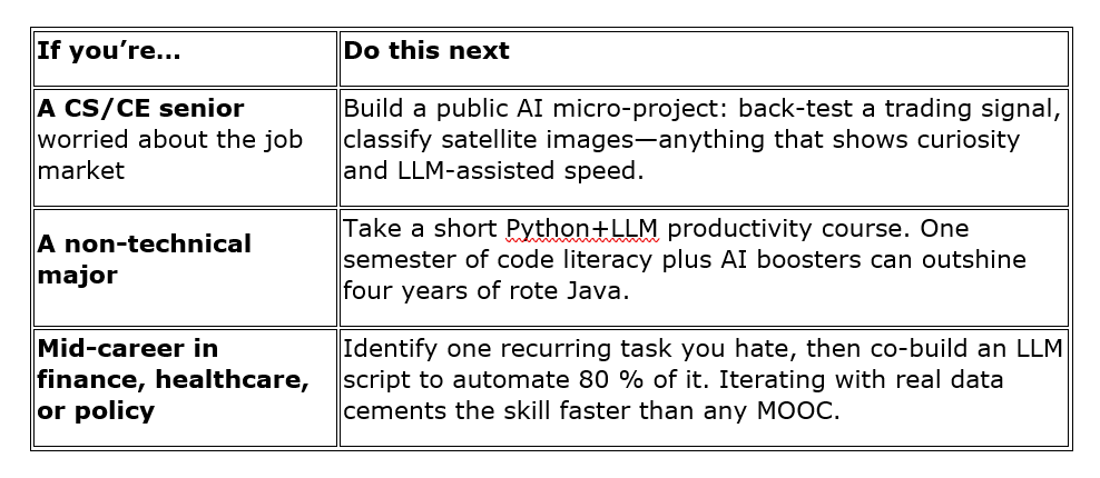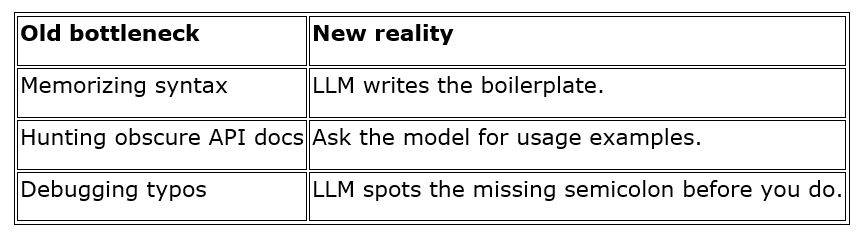 In other words, coding didn’t lose its value; it leveled-up its entry exam. The bar is no longer can you memorize syntax? but can you wield code + AI to solve problems others can’t?